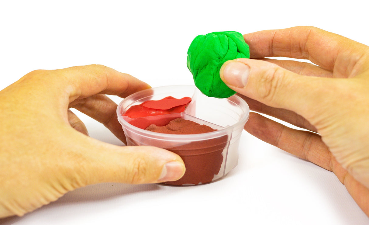 Dinosaur themed tub of mixed putty colours including red, green and yellow. Take a lump of this putty and roll it into a ball, then throw or drop it on a hard surface and watch it bounce. It behaves like a typical bouncy ball, only you can mould it's shape. Choose to merge the putty colours together or keep them separate.