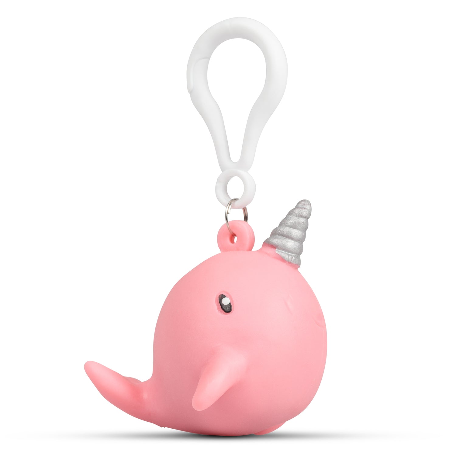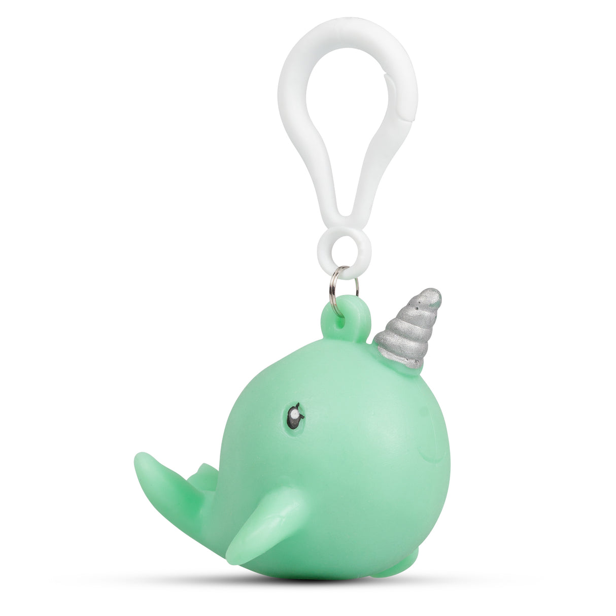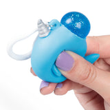 Collectible bag clip that features a squeezy narwhal figure. Squish the marine creature and a bubble of water will spout from it's head, which retreats again when you loosen your grip. Available in four designs.