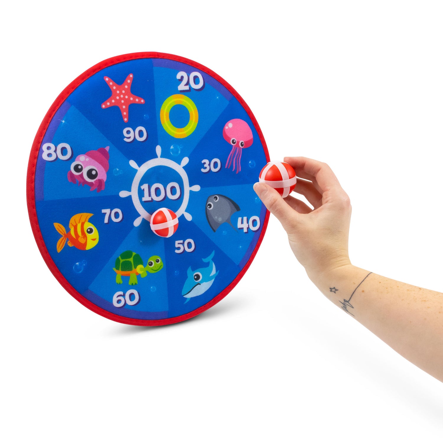 Jeu de cible autocollante réversible ! Avec ce jeu, vous obtenez deux jeux complets en un. D'un côté, vous découvrirez un thème océanique aux couleurs vives et aux personnages amusants. De l'autre, un jeu de cible classique. Vous aurez trois balles à lancer sur le plateau pour voir qui marquera le plus de points. La surface de jeu est recouverte d'un matériau adhésif pour que les balles restent collées après l'impact. Idéal pour les enfants de tous âges, ce jeu promet des heures de plaisir.