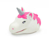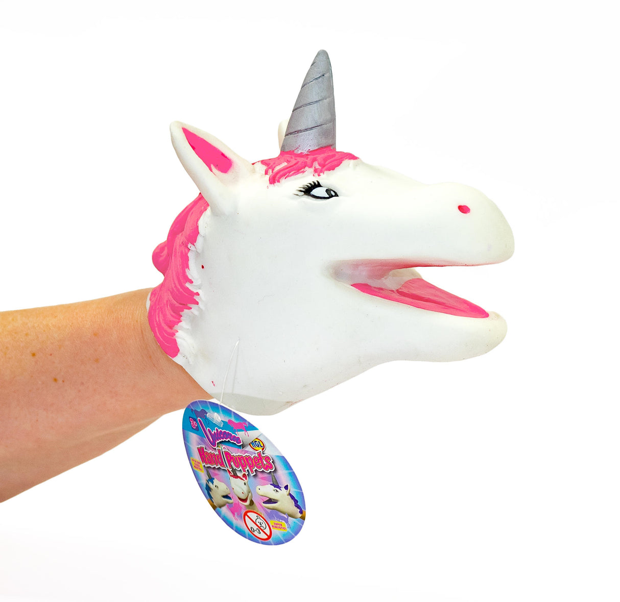 Marionnette à main en forme de licorne. Glissez la tête de la créature sur votre main, puis actionnez sa bouche avec votre pouce et vos doigts. Disponible dans un assortiment de modèles.