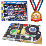 Coffret de jeu Fresh Metal sur le thème des véhicules d'urgence, comprenant huit figurines en métal moulé sous pression, des accessoires de route et un tapis de jeu détaillé. Ce coffret comprend un hélicoptère, un camion de police, une ambulance, un fourgon de police et quatre autres voitures de police. Le tapis de jeu présente une série de routes avec des intersections, ainsi qu'un rond-point, prêts à être délimités grâce aux cônes et barrières fournis.