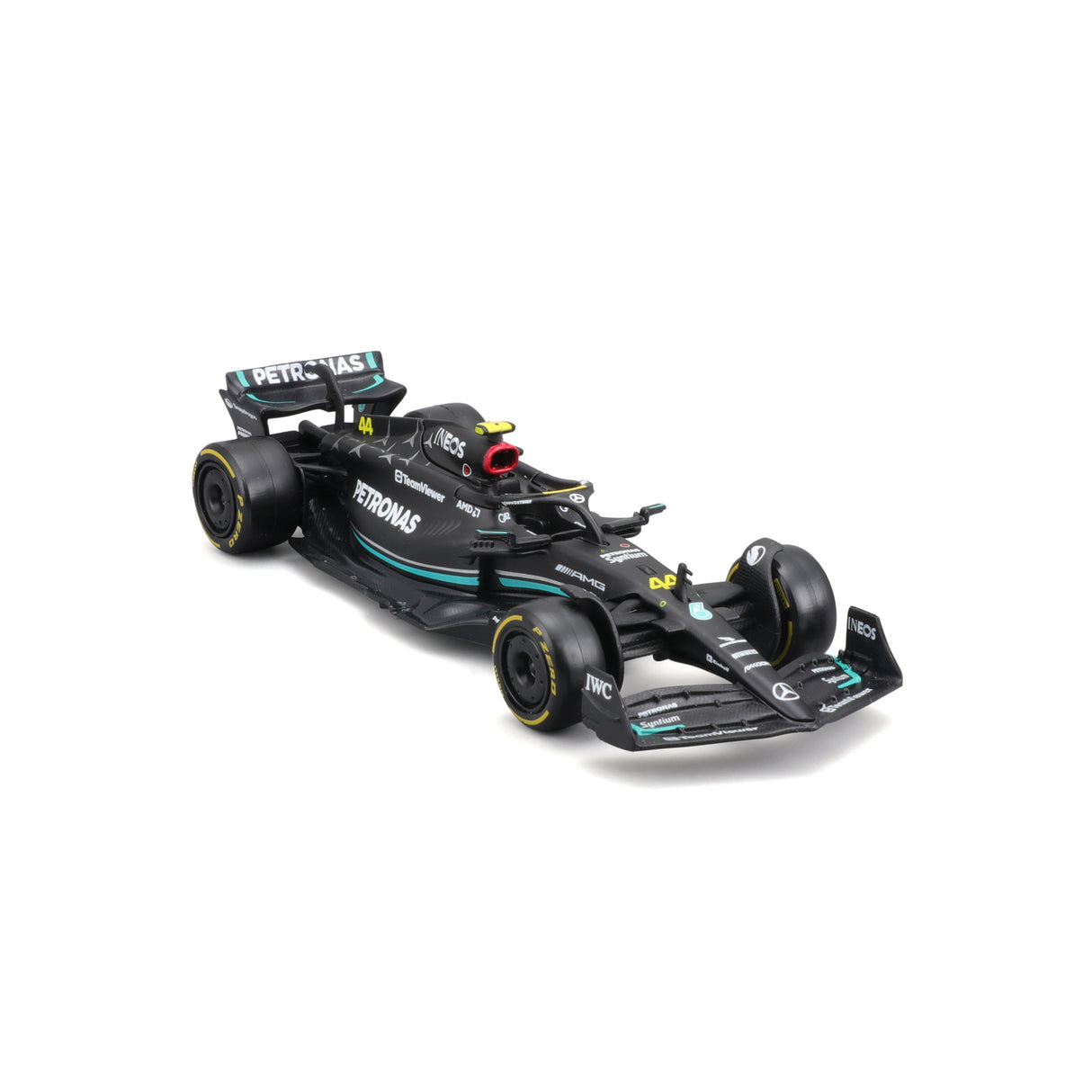 An intricately crafted replica of an F1 Mb W14 2023 car as driven by Lewis Hamilton. This 1:43 scale diecast replica perfectly recreates the distinctive shape of the F1 car, capturing every aerodynamic curve and line as it can be seen on the real vehicle. The level of detail on the surface is incredible, with authentic sponsor and race decals perfectly recreated.
