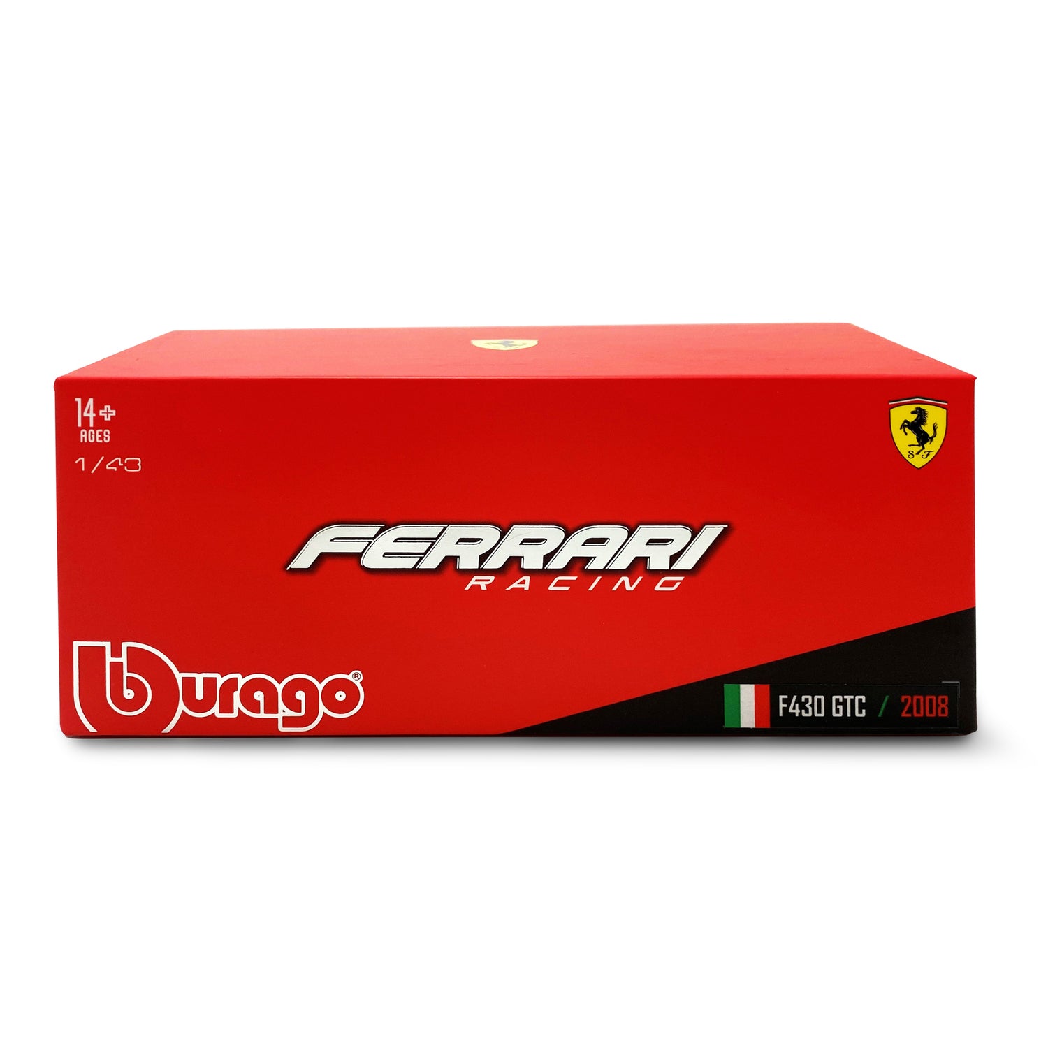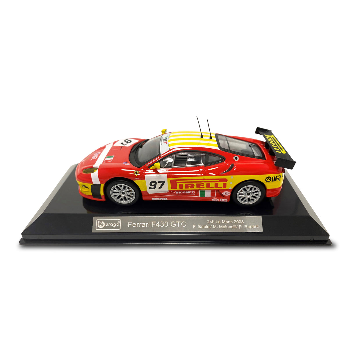 Diecast model of a 1:43 Ferrari F430 GT2 (2008). This highly detailed model from the Ferrari Racing series meticulously recreates the body of the original car, capturing each sleek curve, line and angle. The attention to detail spreads across the chassis and into the interior, with every piece and part accounted for. An electrostatic paint coating is used to give it that perfect finishing touch. Each model is mounted on a display stand in acrylic gift box packaging.