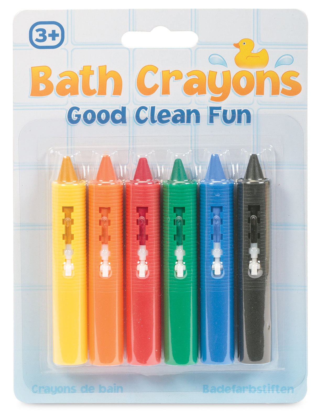Crayons for use in the bath in an assortment of colours, allowing children to be artistic and get clean at the same time. Crayons slide back into casing when not in use.