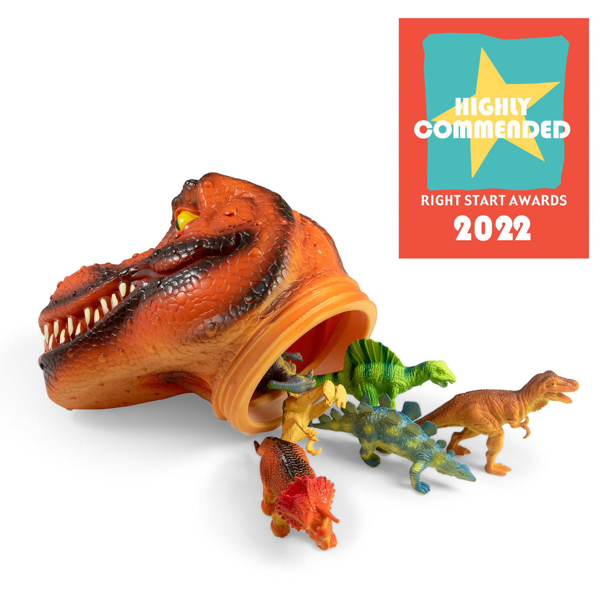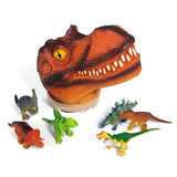 Large tyrannosaurus rex dinosaur head that also acts as a storage tub. This impressive bust looks like a fantastic display piece, showing off a detailed t-rex baring its teeth. Flip it over and pop off the lid to find a stash of six assorted dinosaur figures.
