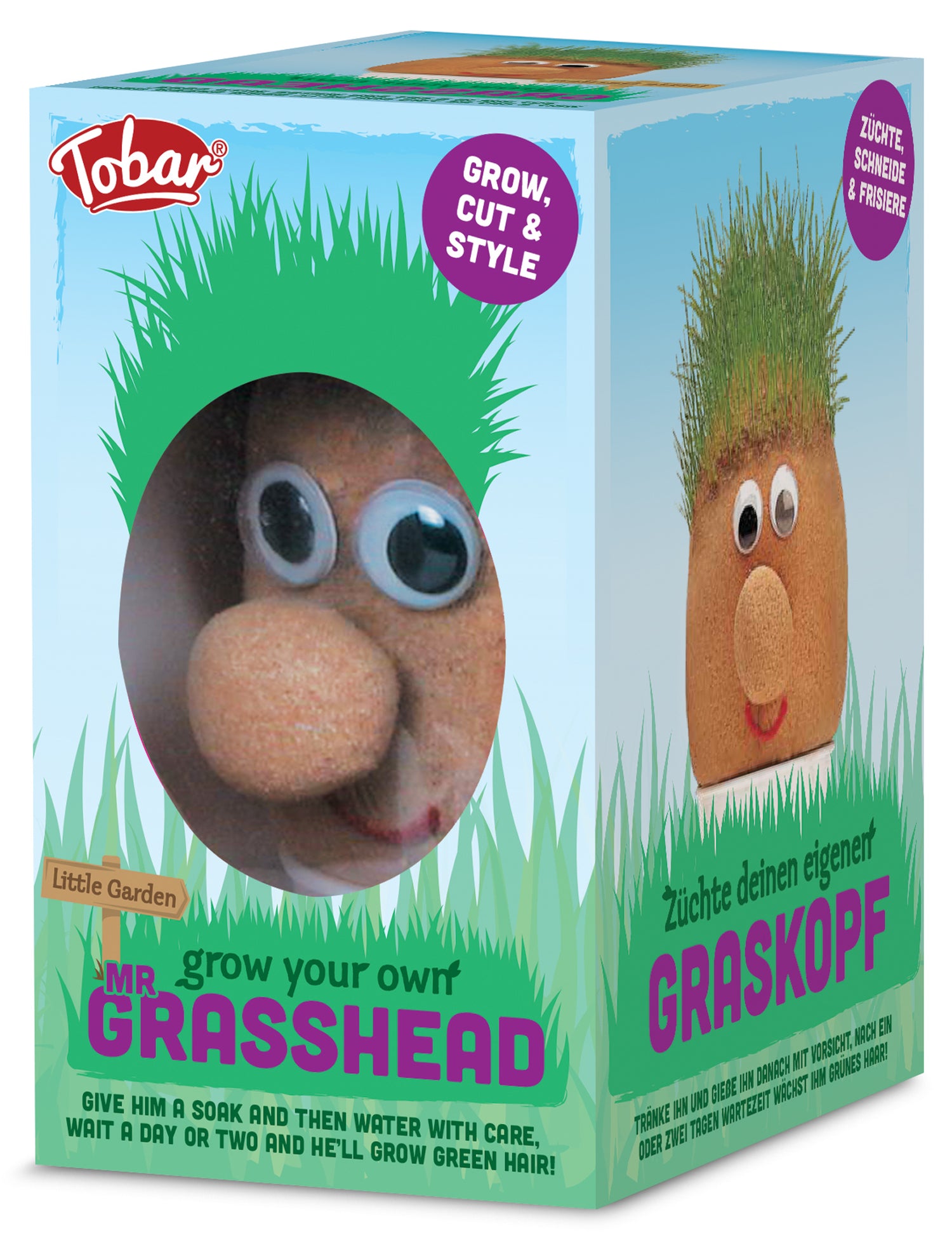 A large fist-sized head stuffed with sawdust. Grass seed is mixed into the top so that when watered, grass sprouts like green hair, which can then be trimmed and styled and will continue to grow while he is properly maintained. A watering saucer is provided.
