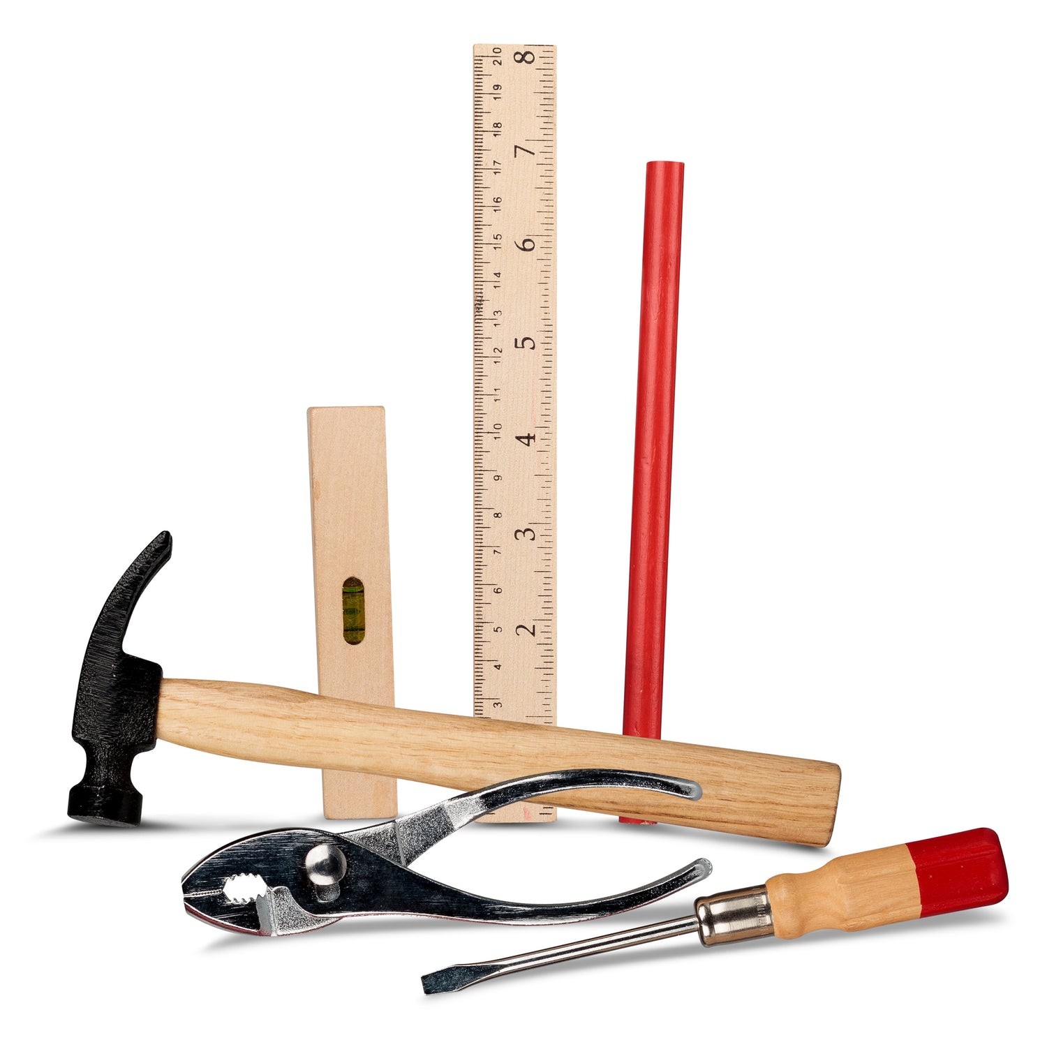Fully functional, child-sized hammer, pliers, screwdriver, spirit level, rule and chunky pencil, made from a combination of wood and metal - just like the 'real' thing! The tools are stored in a leather-effect pouch, which can be slipped onto a belt.