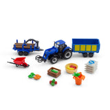 The agriculture farm playset boasts a licensed New Holland diecast model tractor that is impressively detailed. The vehicle has chunky free-rolling wheels, mud guards, and a cab that closely resembles the real thing. It also comes with a front loading arm and tow hitch that can be used with other scale trailers. In addition to the tractor, the set includes vegetables and tool accessories, as well as a logging trailer with a working arm and a bale transport trailer.