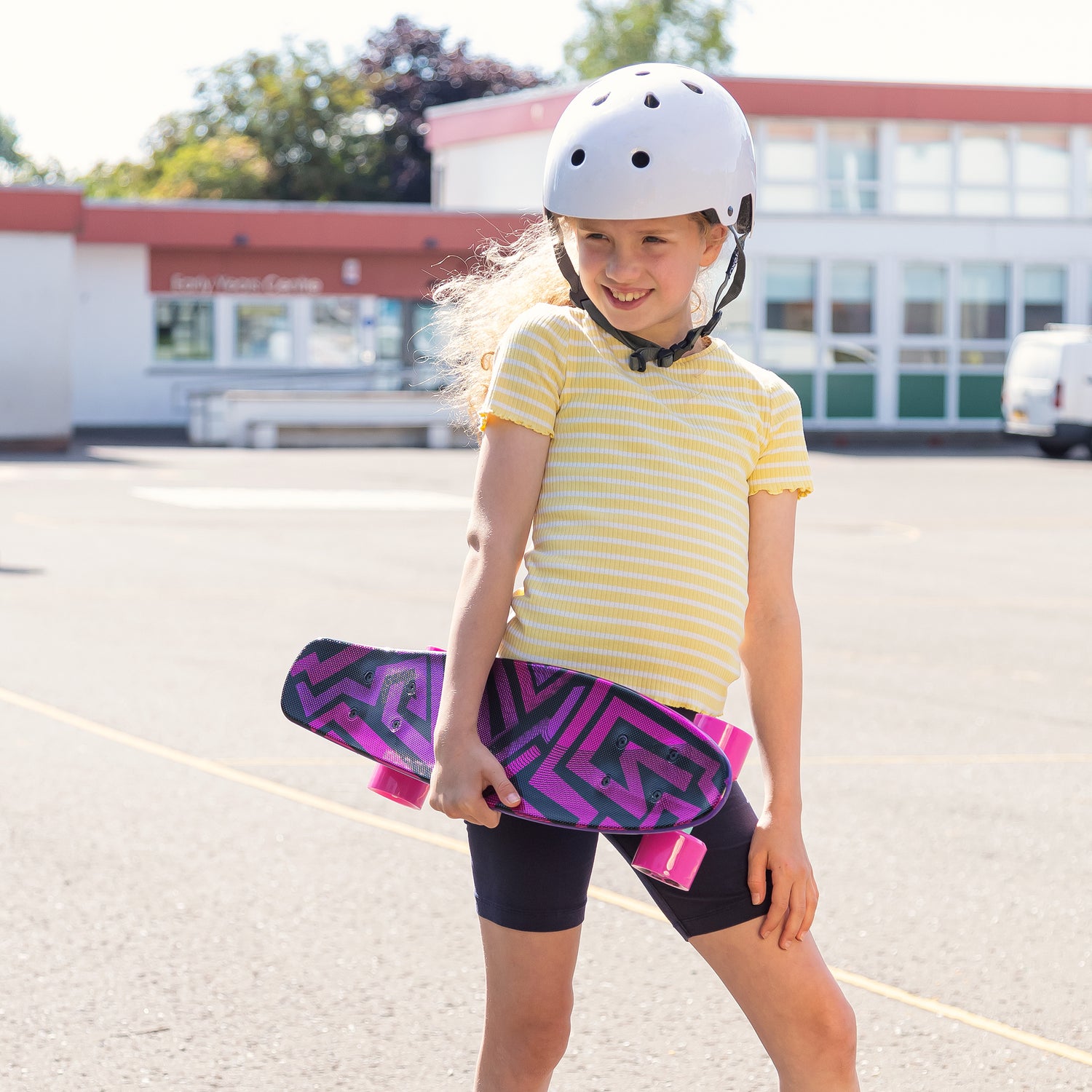 Brightly coloured skateboard with a cool design that is mirrored both sides of its plastic deck. This stylish and retro fishboard design is great for young skaters, with a compact design that's perfect for smaller feet.