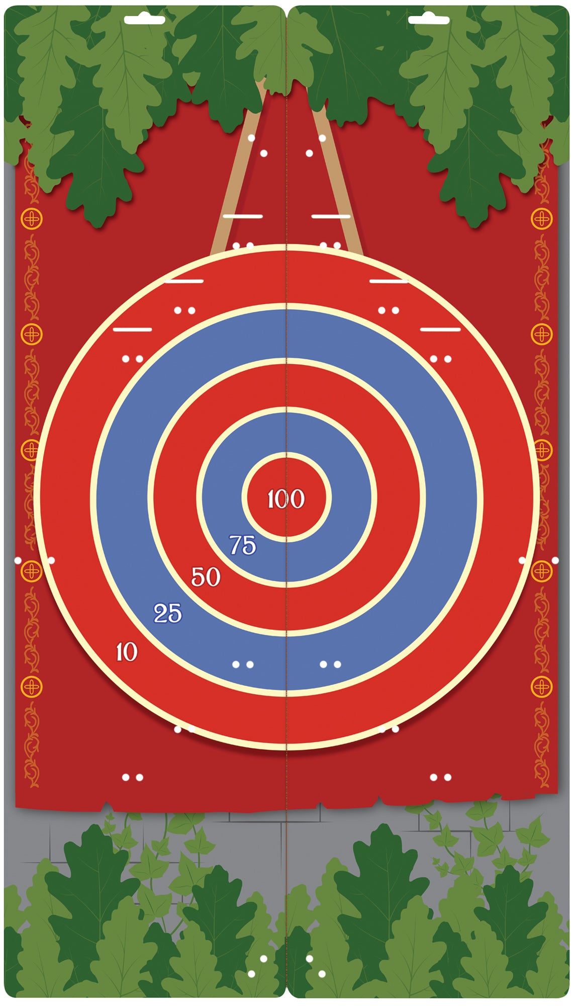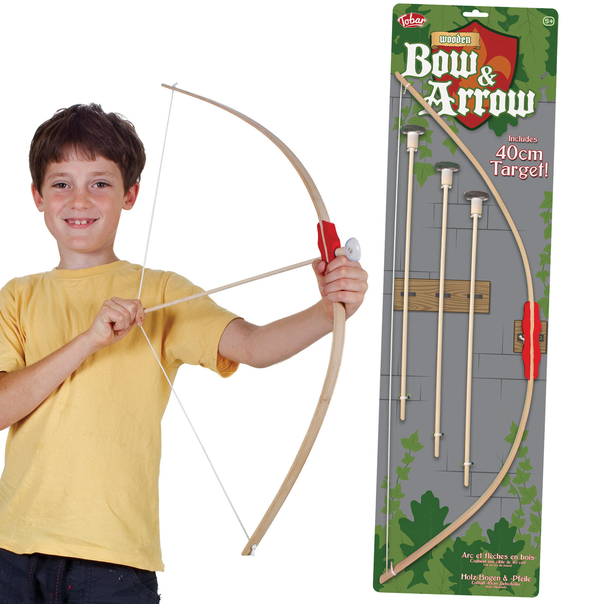 Traditional wooden bow and three arrows (with suckered ends for safety). The header card unfolds to reveal a large target that can be hung or propped up for lots of inventive Robin Hood games.