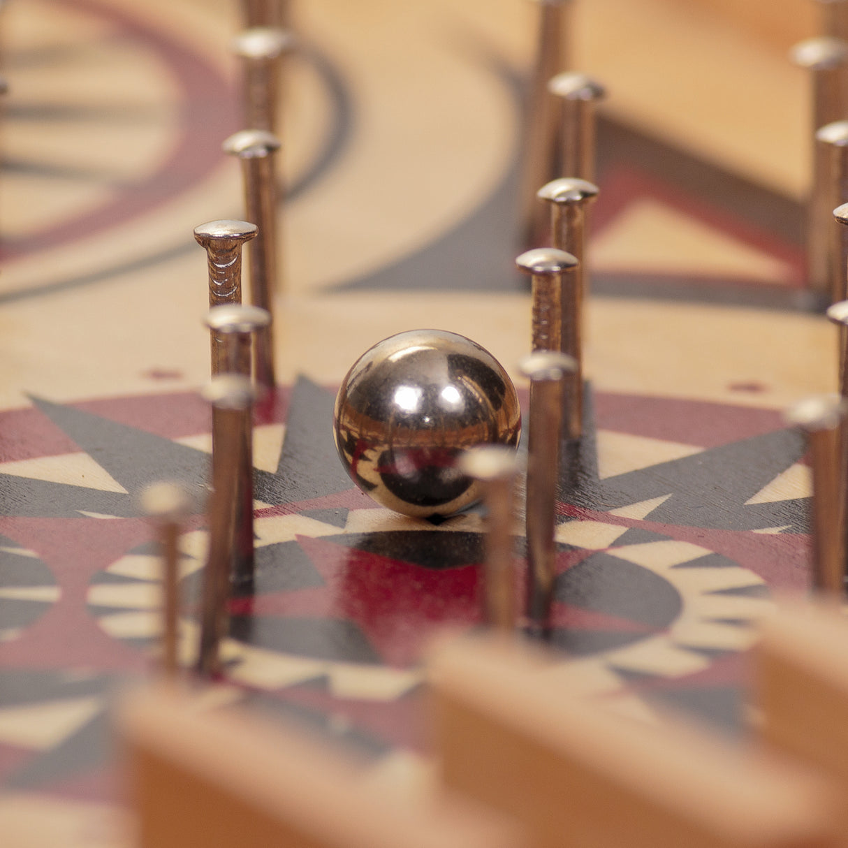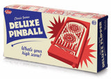 Wooden pinball game with spring launcher and metal pins to direct the balls as they fall. When pulled and released the handle launches one of the ball bearings up and onto the game board where it tumbles through the pins to land in one of the scoring zones at the bottom. Once all balls have been launched the recovery rail slides out and returns all balls to the launch queue. His classic pinball game comes in brilliant retro-inspired packaging and looks perfect as part of any traditional games range.