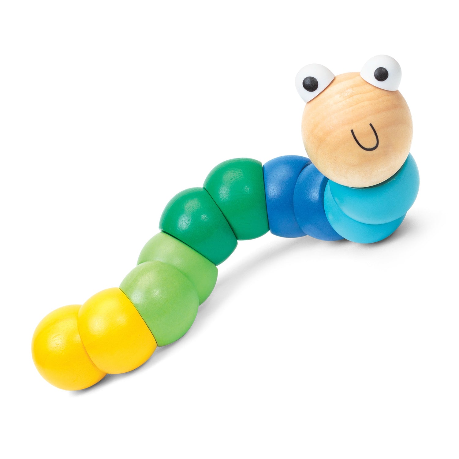 Wooden worm toy with jointed body sections linked together by an elasticated cord. This jointed flexi toy can be posed into several different positions by twisting and turning the colourful sections. There are two designs available, each one with a natural wood head and five different body colours leading to a yellow tail.