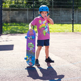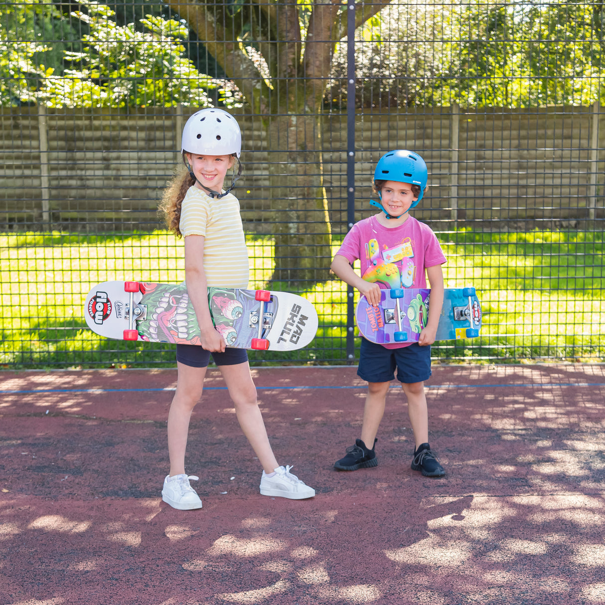 Wooden maple skateboard with plastic wheels. This skateboard is approximately 71cm in length and features a graphic on the underside of the deck. It is ideal for skating around, and, with a little practice, can also be used to pull off a range of skateboard tricks.