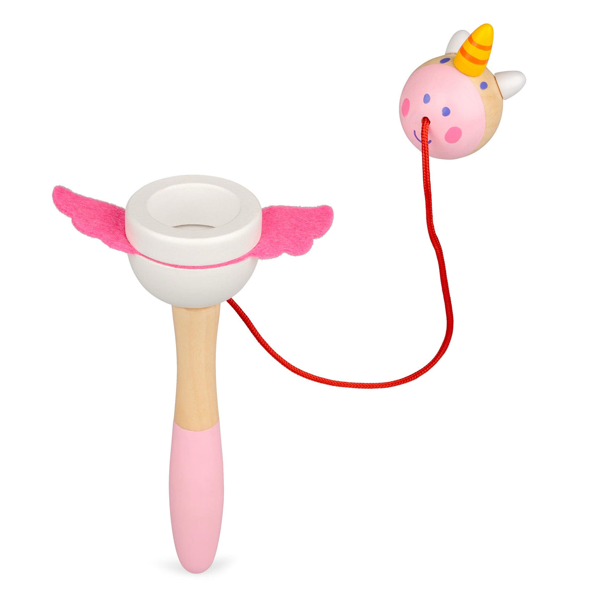 Classic cup and ball game re-imagined to feature dragons and unicorns. The cup features felt wings, whilst the tethered ball features a horn and eyes that really flesh out the details of the creature on which it is based. Players must flick the ball upwards and attempt to catch it in the cup. It's a traditional favourite that people cannot resist trying, making it an effective demo line too.