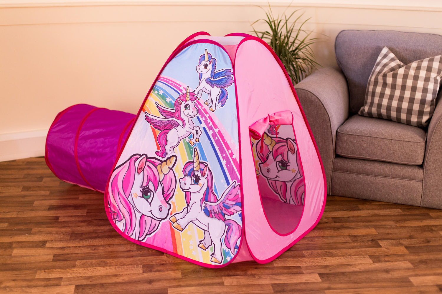 Unicorn themed pop up play tent with a tunnel that leads into it. Simply remove it from the packaging and the tent takes shape, with canvas cover walls and a cylindrical tunnel instantly popping up into a rigid structure. It's covered with cheery unicorn designs and provides a fun space that's suitable for play both indoors and out in the garden.