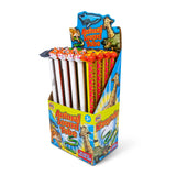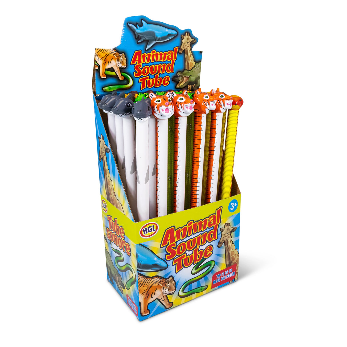 Tube toy topped with an animal head. When tipped or tuned over the internal slider in the tube slides downwards, creating a loud groaning noise as it slips from top to bottom. Five different animal designs including a shark, crocodile, tiger, giraffe and snake.