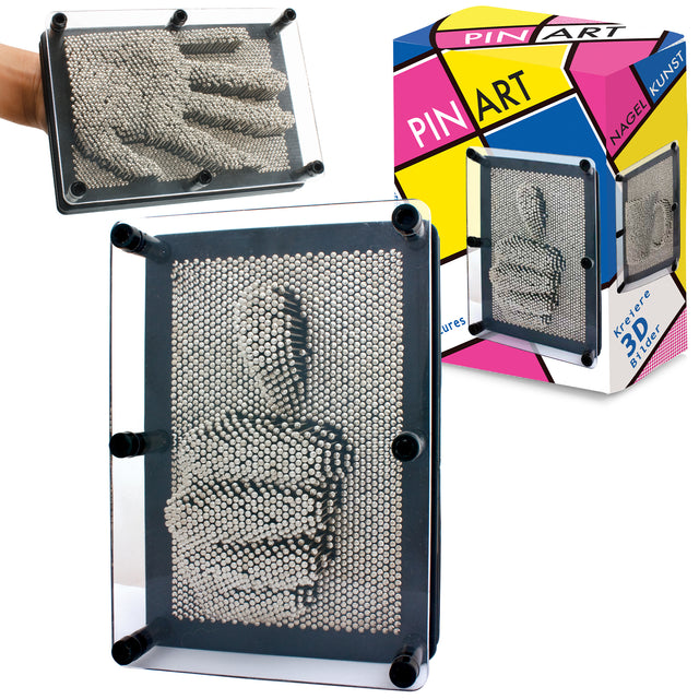 Pin Art is one of those products that anyone conscious during the 80s and early 90s will be very familiar with. Simply pressing an object (or appendage) into the multitude of blunt pins will create a 3D sculpture with all the subtleties of the contours faithfully captured. The impression remains intact as long as the device is not disturbed, but the peculiar sensation of the pins, accompanied by the faint, irregular sounds as they move, make this as much a fiddle toy as desktop 'art'.