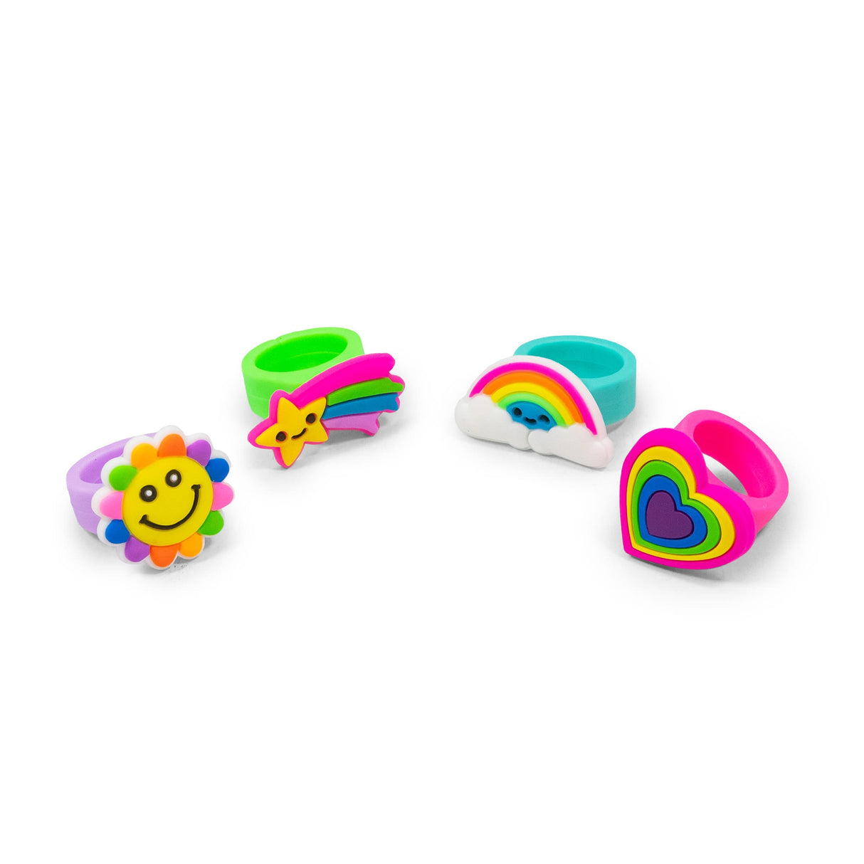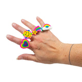 Chunky plastic ring with a vibrant rainbow inspired design. The chunky band features a colour charm with one of several designs that somehow incorporates a rainbow design. From smiley faces and hearts to a classic rainbow arch, each box is packed with funky designs.