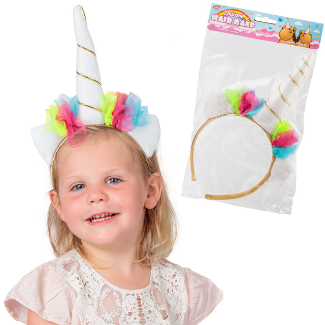 Flexible plastic headband featuring a unicorn horn, ears and a colourful fabric petal garland. This distinctive head accessory not only serves as a great way to hold hair back, but it also grants anyone who wears it the distinctive look of a magical unicorn.