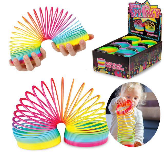 This large, multi-coloured plastic coil is an excellent fiddle toy and can successfully perform that most essential of functions; it really can walk down stairs! The rainbow of colours along its length makes it extremely pretty, whilst its generous size and great play value ensure a broad appeal. The individual Rainbow Springies are wrapped with an easily removeable label to discourage any tangles before purchase.