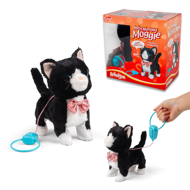 Cute and fluffy animated plush cat with an adorable bow collar. Place this kitten on a flat surface and use the lead controller to make it walk, meow and wave its tail. It's covered in soft black and white fur, giving it a coat that's hard to resist stroking. This, combined with the animated features, make it a very effective demo line that is sure to attract attention wherever you put it. Part of the Animigos range.
