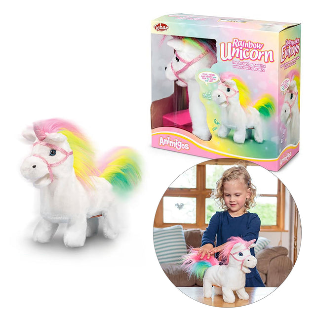 Peluche licorne entièrement animée et dotée d'une magnifique crinière arc-en-ciel. Lorsqu'elle est activée, la licorne trotte en avant, émettant parfois un son scintillant magique. Cette peluche animée est une pièce d'exposition attrayante qui attirera tous les regards. Fait partie de la gamme Animigos.