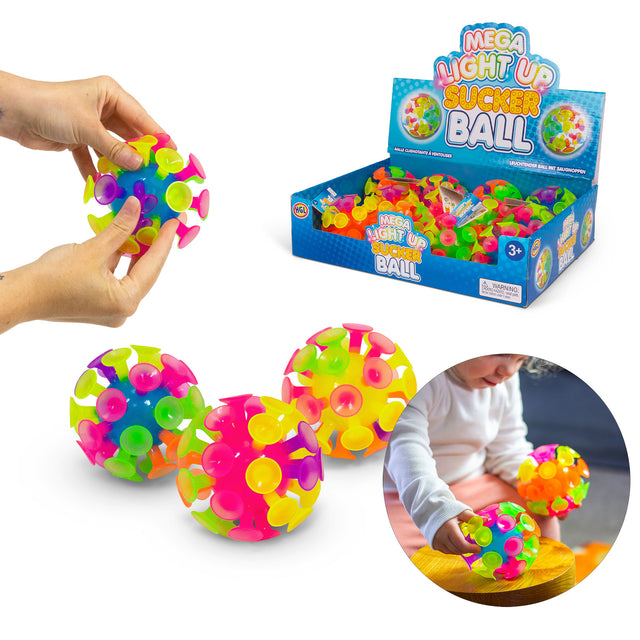 Experience the magic of our Mega Light Up Sucker Ball! Toss it against a wall and enjoy the vibrant light show as the lights flash on impact. With its soft, tactile design, this suction cup ball engages kids in sensory play, encouraging touch and visual stimulation. Perfect for bouncing and sticking to walls or windows, it promises giggles and endless entertainment for children everywhere. Approx 10cm.