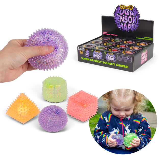 Indulge your senses with Scrunchems Sensory Sugar Shapes! These squeezable wonders feature soft spiky skin for a tactile treat. Embrace the squishy satisfaction of four sugar-inspired shapes – cube, sphere, pyramid, and cylinder. Each shape comes packed in its own individual box and CDU, ready to sweeten up your sensory playtime!